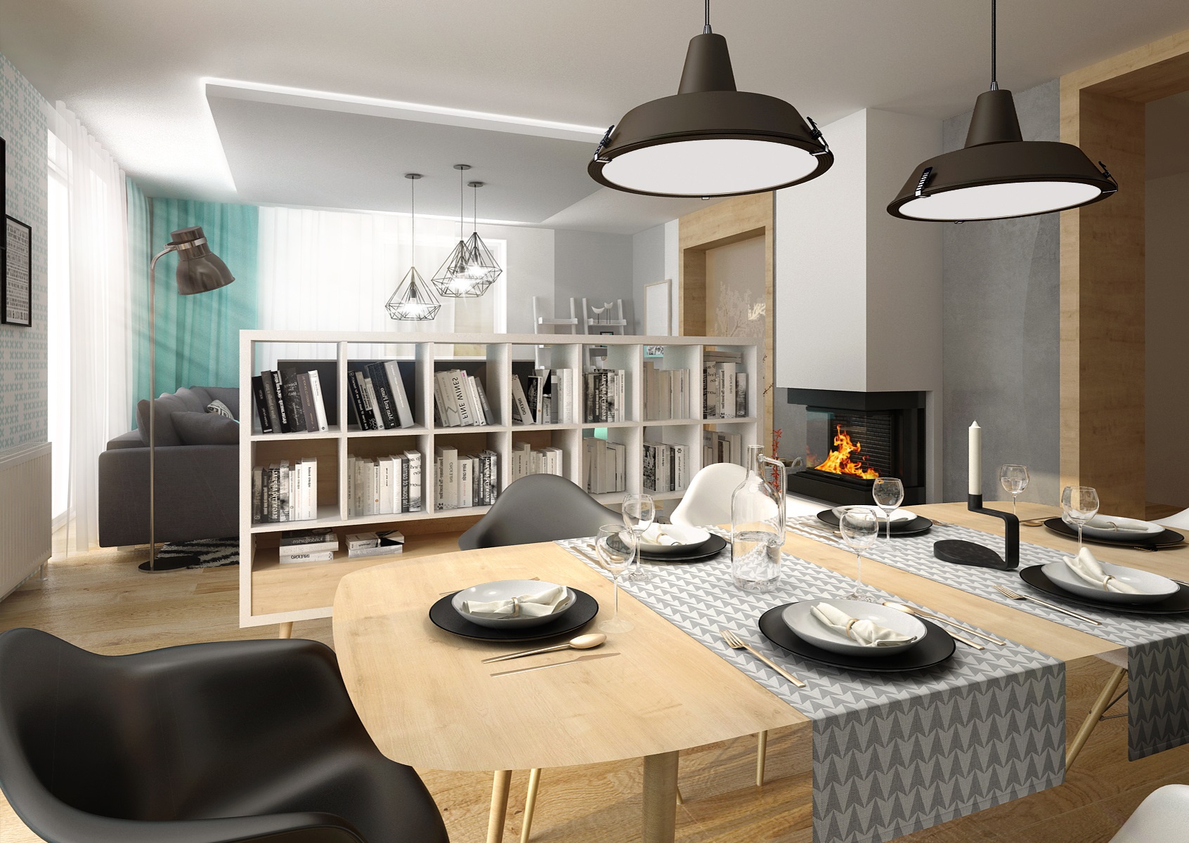 Z obou částí pokoje, jak od stolu tak z pohovky, pak můžeme sledovat plápolající oheň v krbu, což je jistě příjemným bonusem této otevřené dispozice.