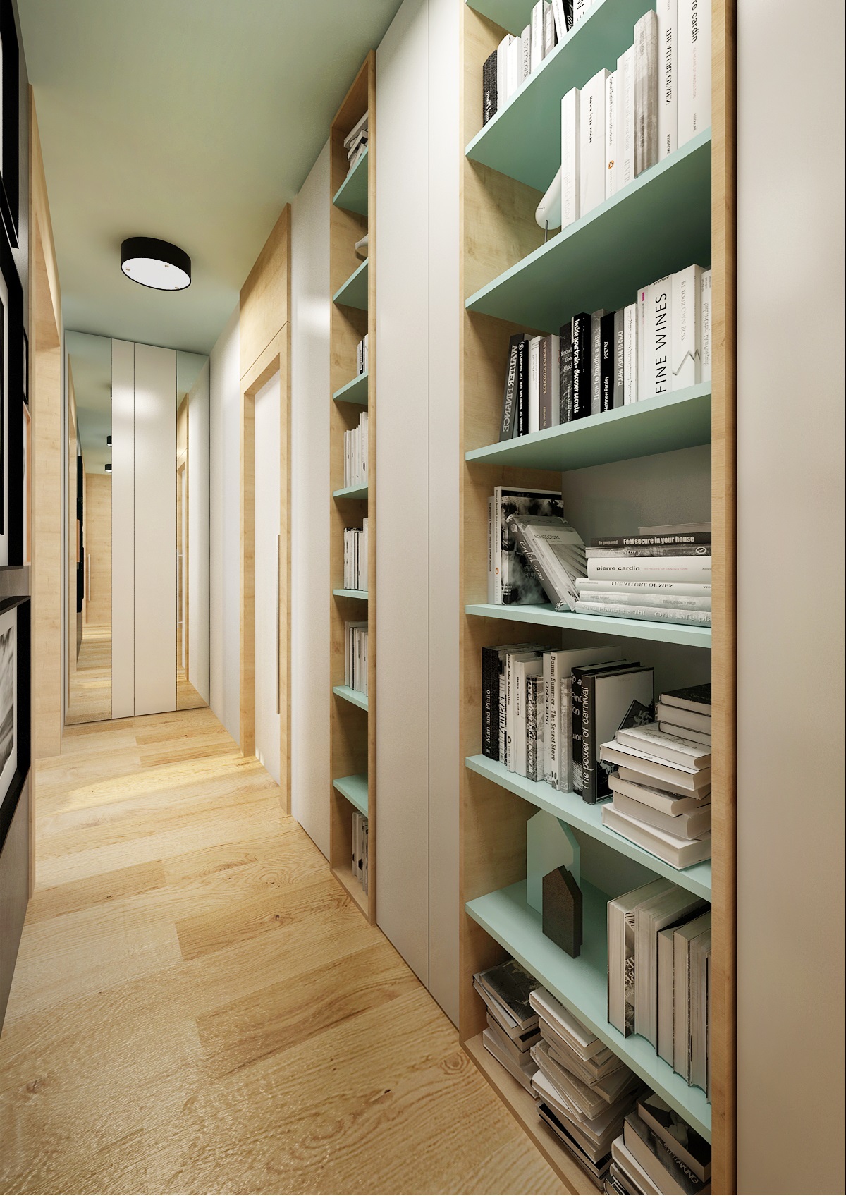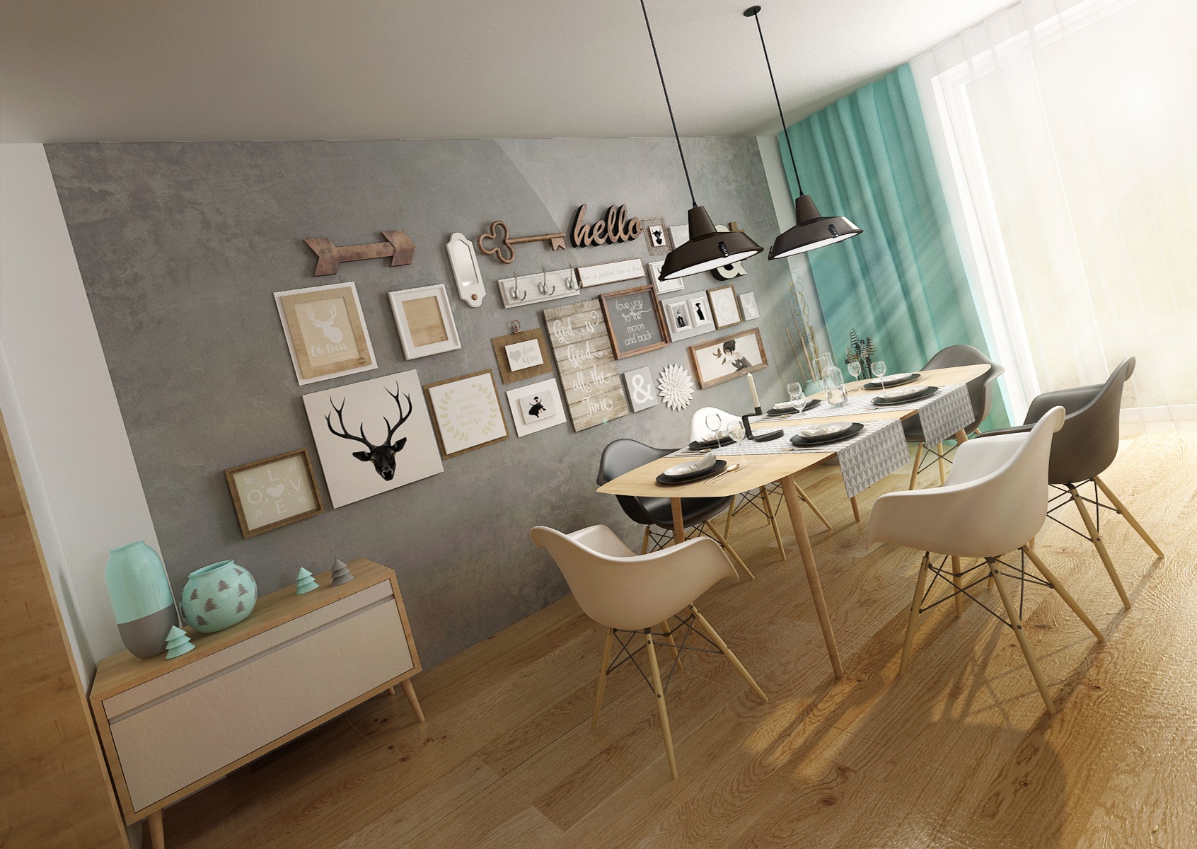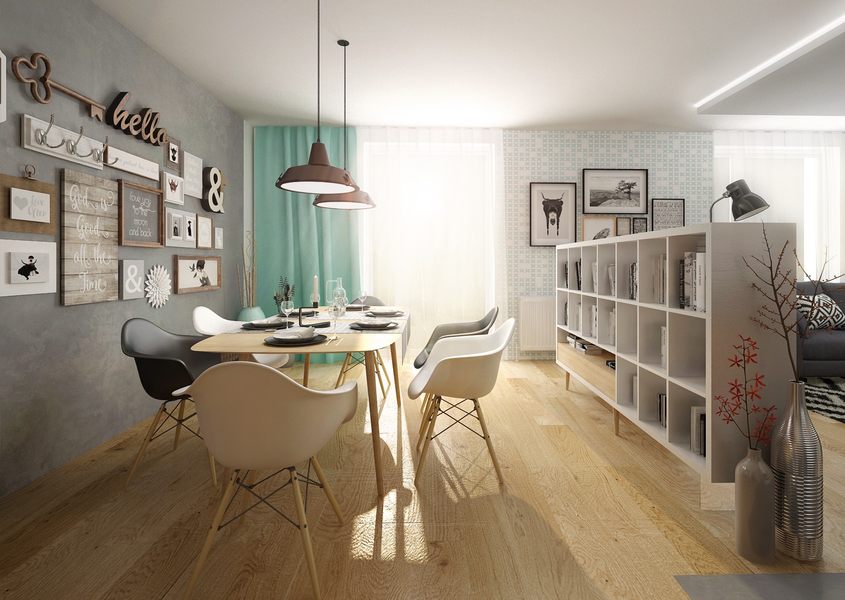 Pokoj je nábytkově rozdělen na dvě funkční zóny: jídelní a obývací. Dělícím prvkem je oboustranně použitelná skříňka- knihovna, ve které je zabudovaný televizor. Jednoduché zařízení je převážně ve světlých odstínech, v přírodním dekoru dubu, v neutrální bílé a šedé, s akcentem ledovcově modré. V kontrastu s tím byla vybrána tmavě šedé sedací souprava či plastové židle u jídelního stolu.