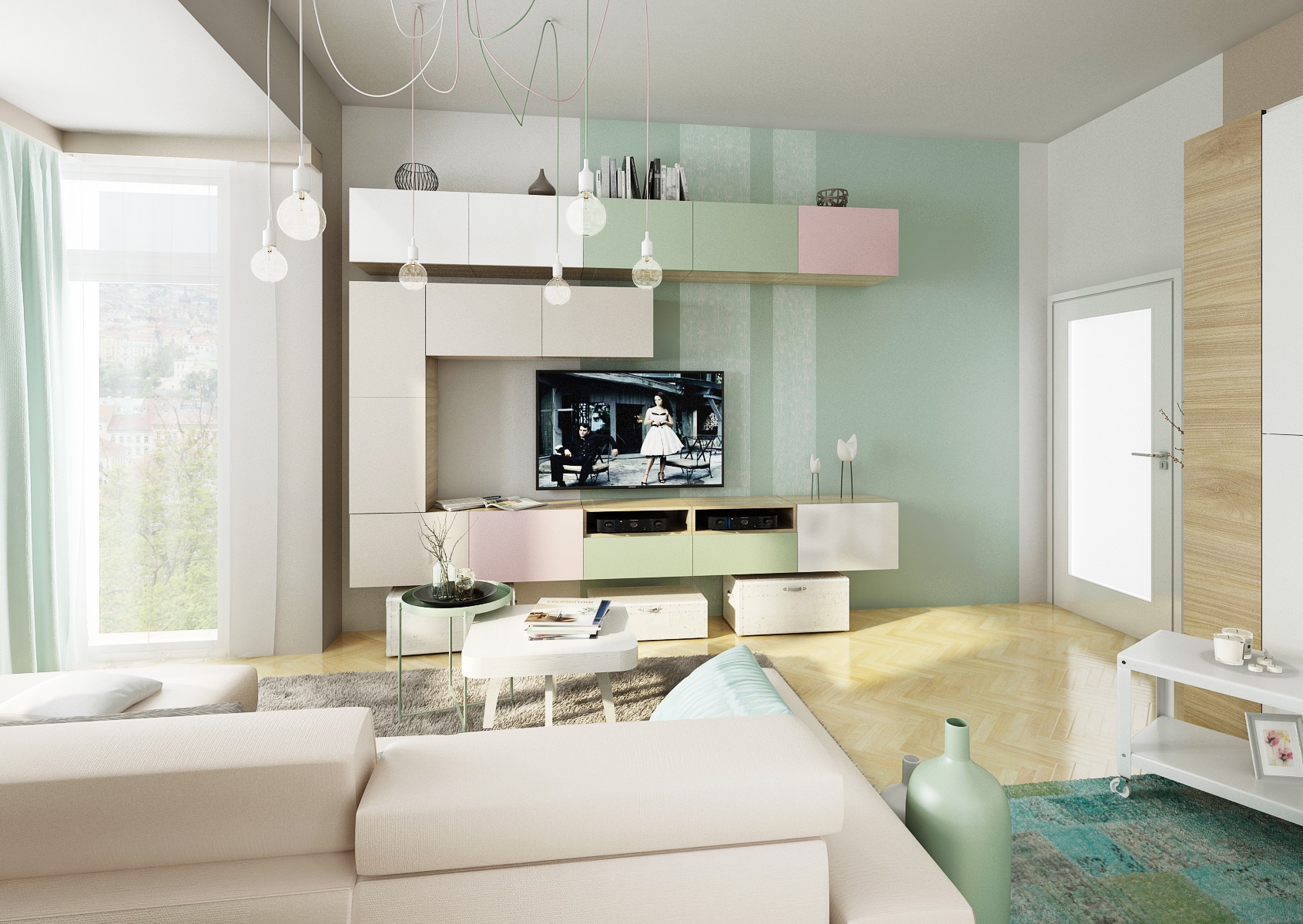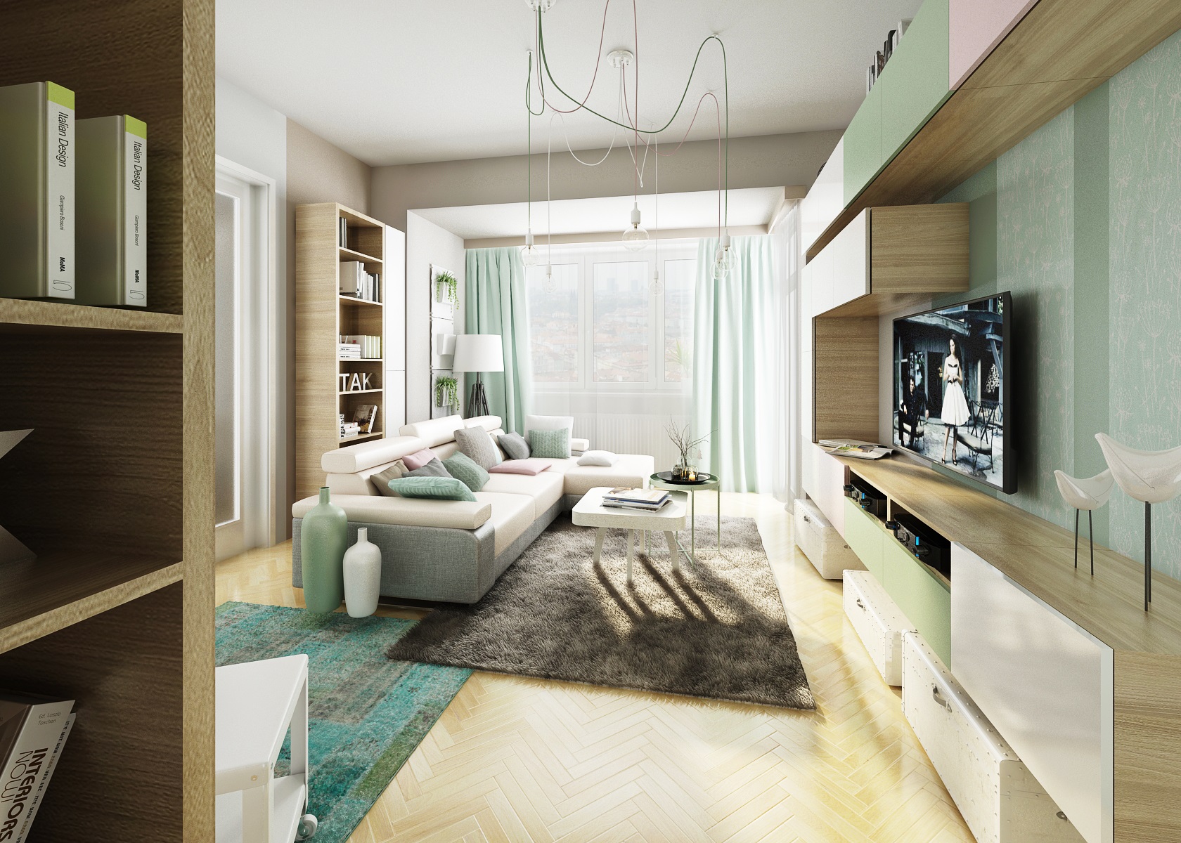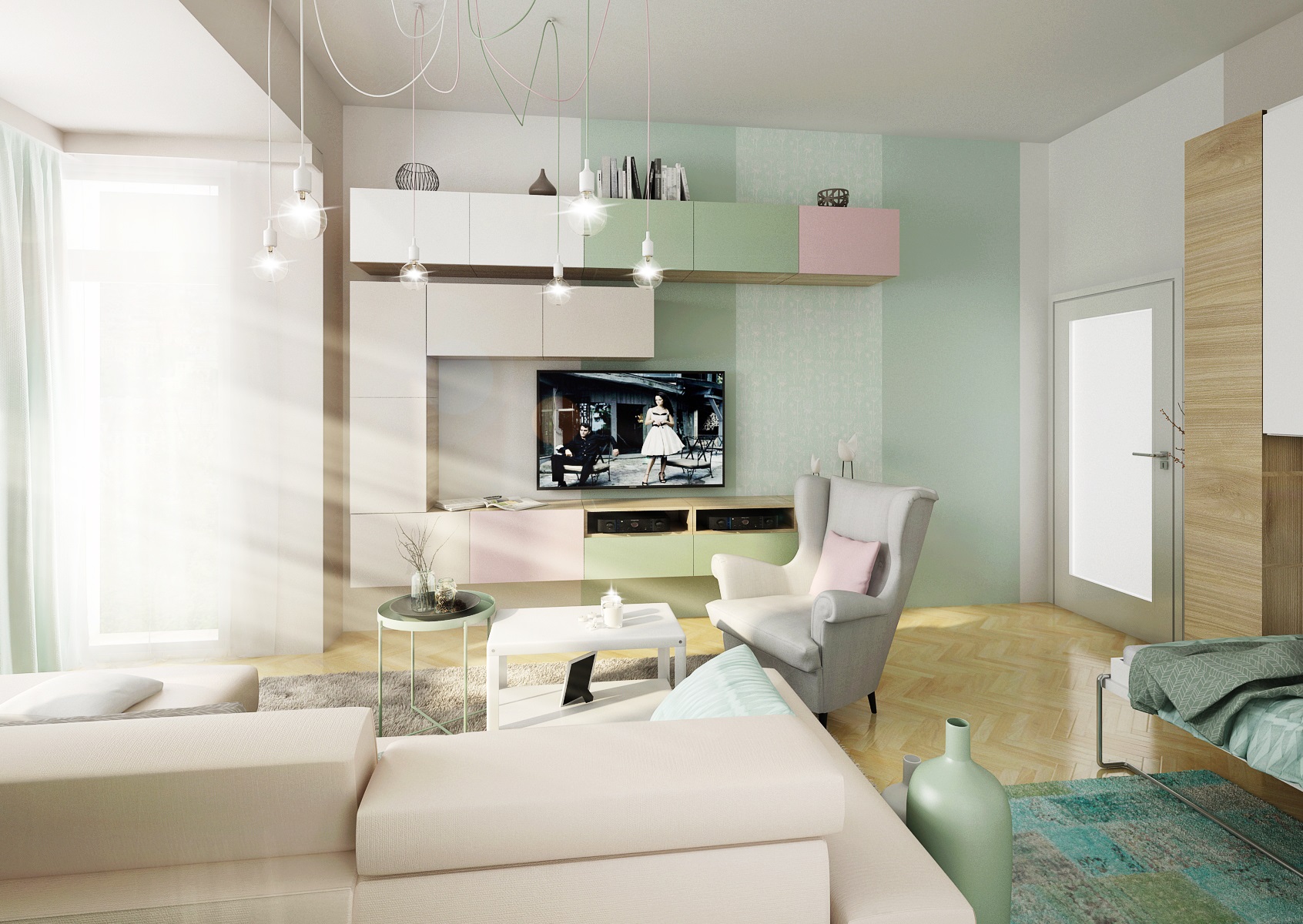 Do návrhu tohoto mintově-zeleného obývacího pokoje jsme dle přání majitelů zakomponovali i