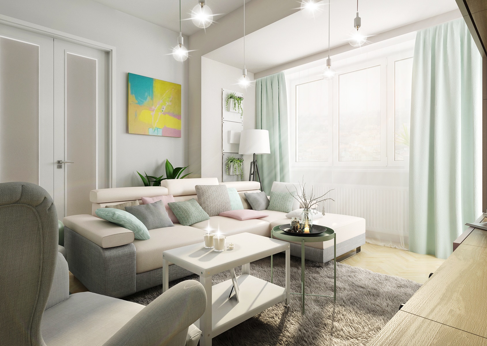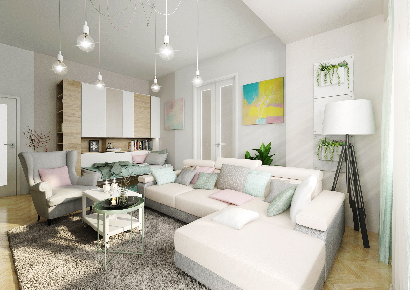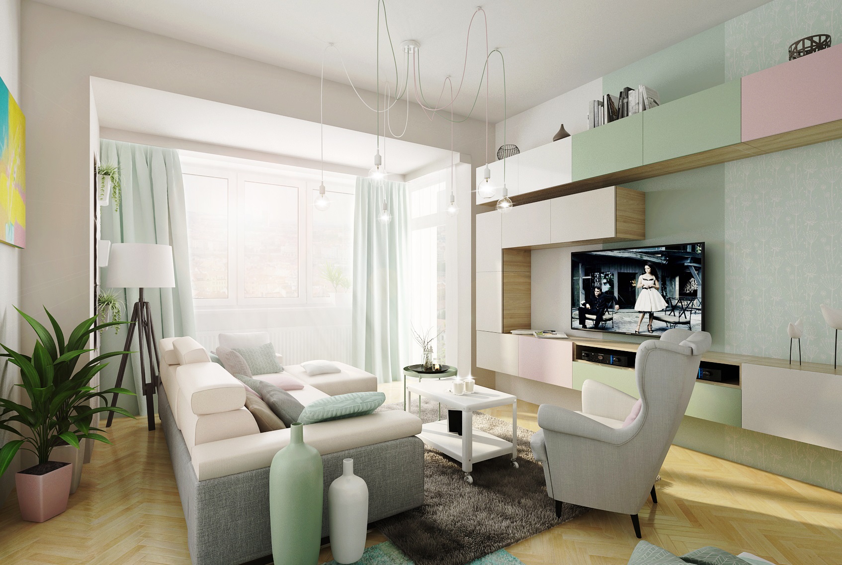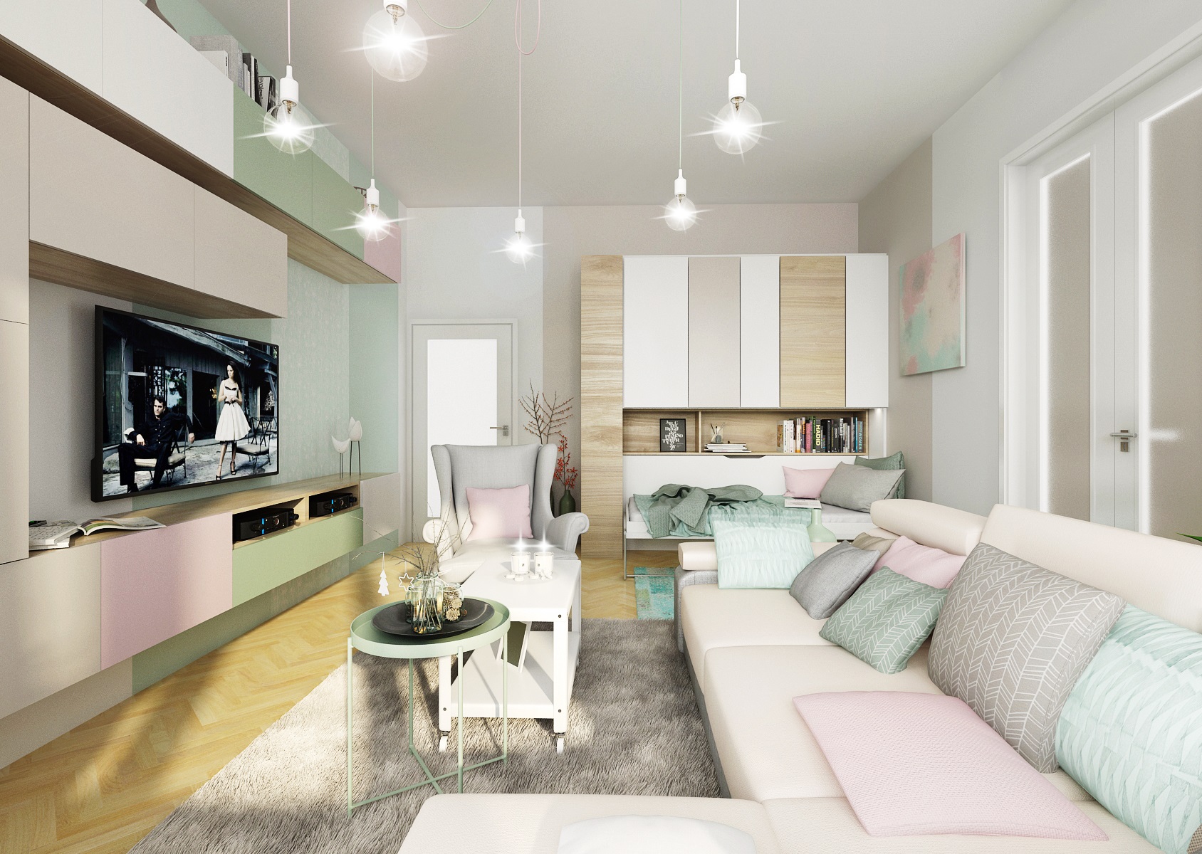 Do návrhu tohoto mintově-zeleného obývacího pokoje jsme dle přání majitelů zakomponovali i