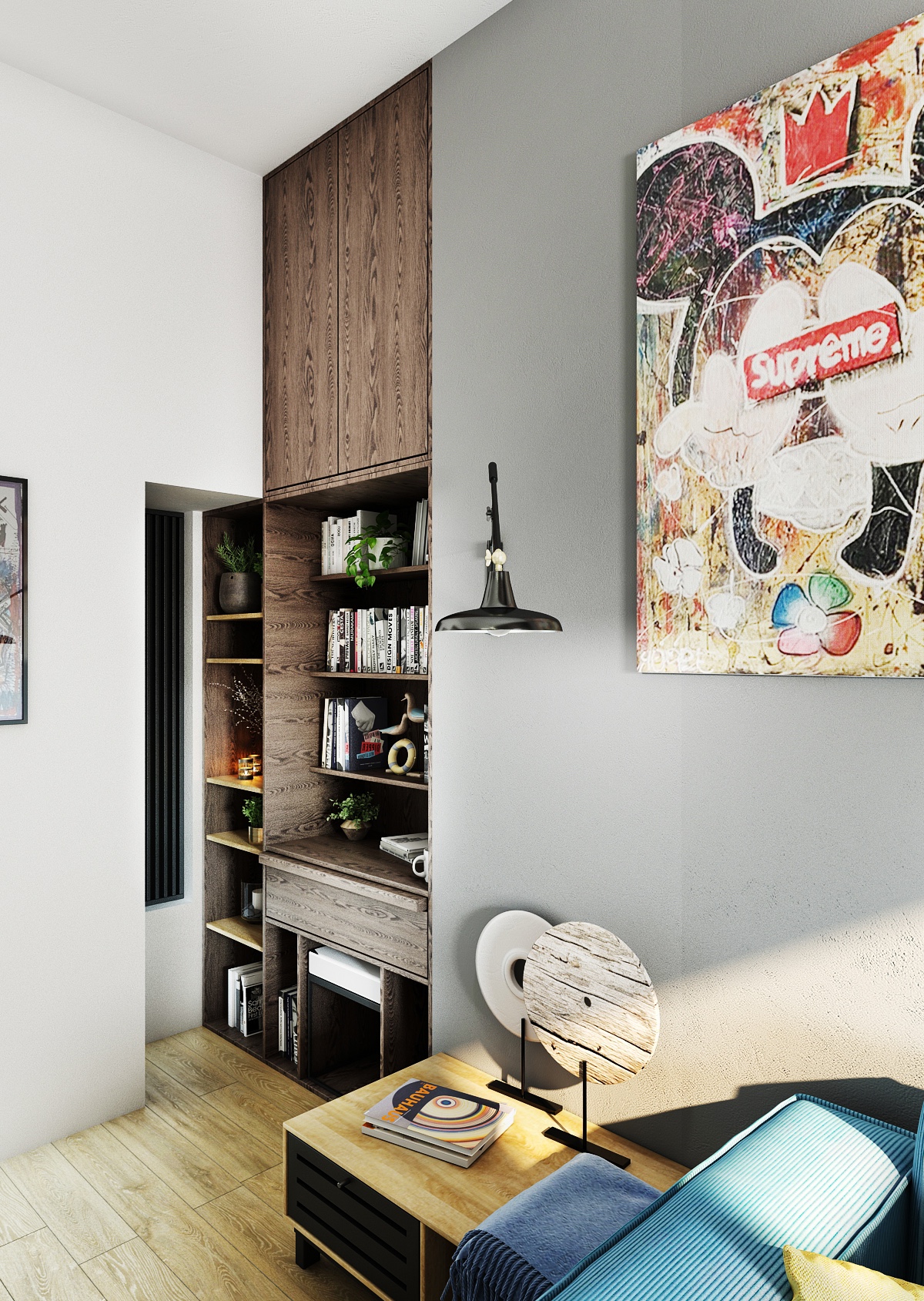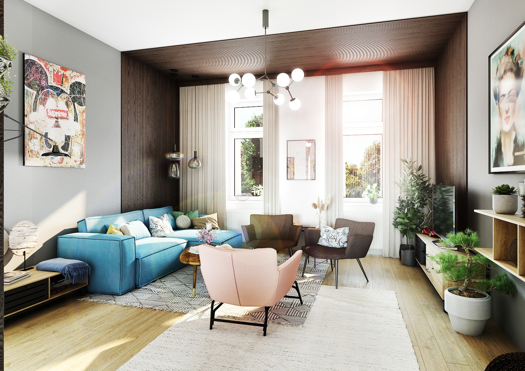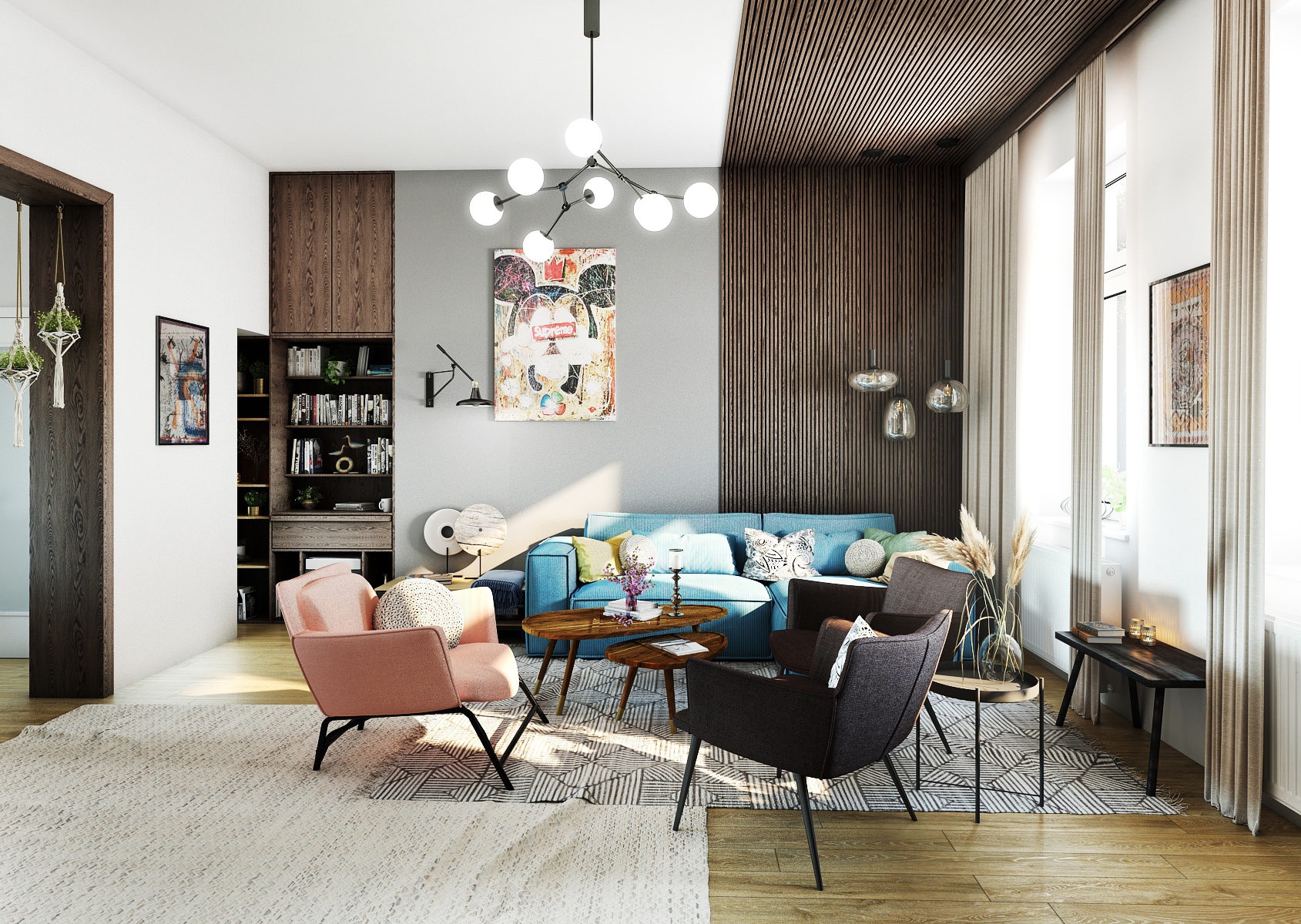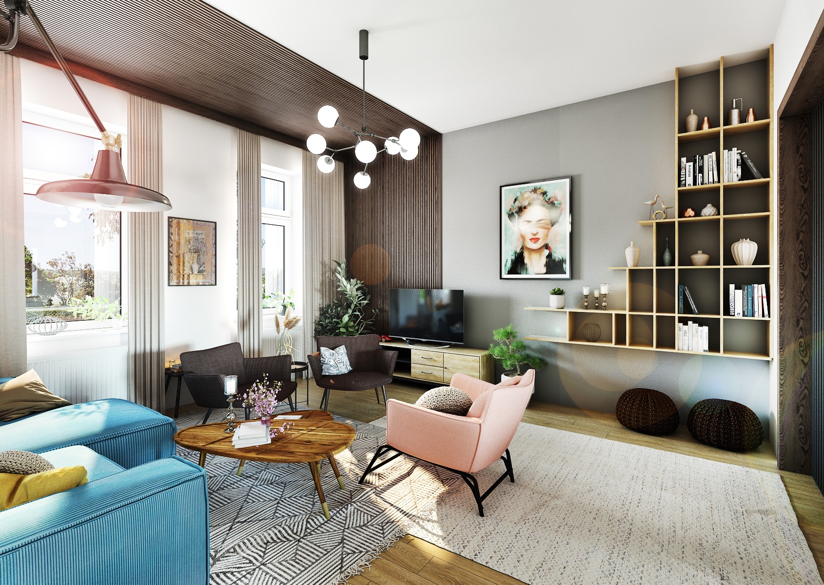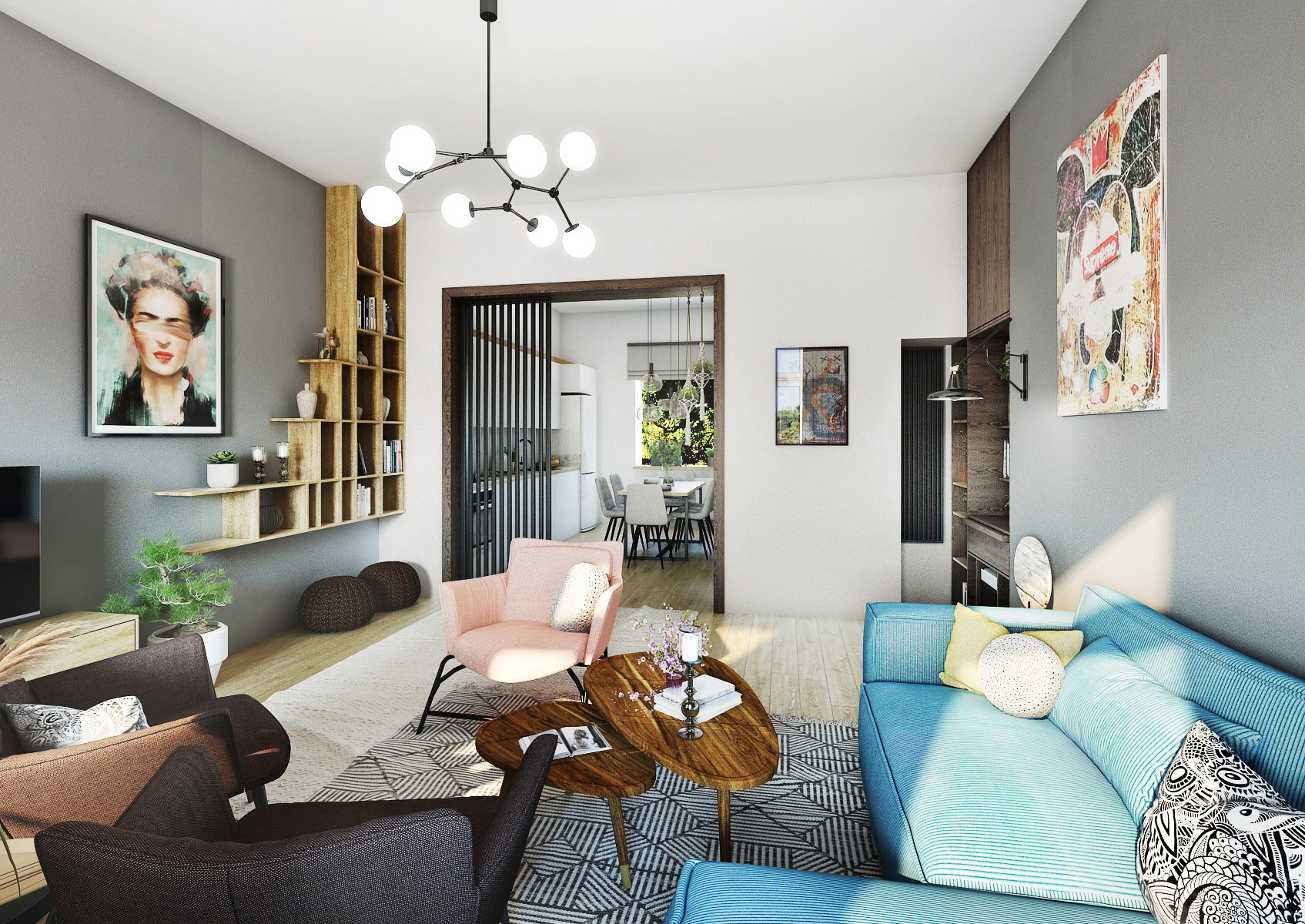Obývací část je zařízena stylovou kombinací pastelových a neutrálních barev, kde dominantní místo zaujímá pohodlná světle modrá sedačka doplněná o barevné polštáře, které prostoru dodávají živost. Zajímavým prvkem je dřevěná stěna s vertikálními lamelami, která dodává prostoru jistou hloubku, zatímco moderní svítidla a umělecká díla na stěnách přidávají osobitý šarm. Nábytek, jako jsou růžová a tmavě hnědá křesla, spolu s unikátním konferenčním stolkem z přírodního dřeva, vytvářejí pohodlné místo pro odpočinek a setkávání.
