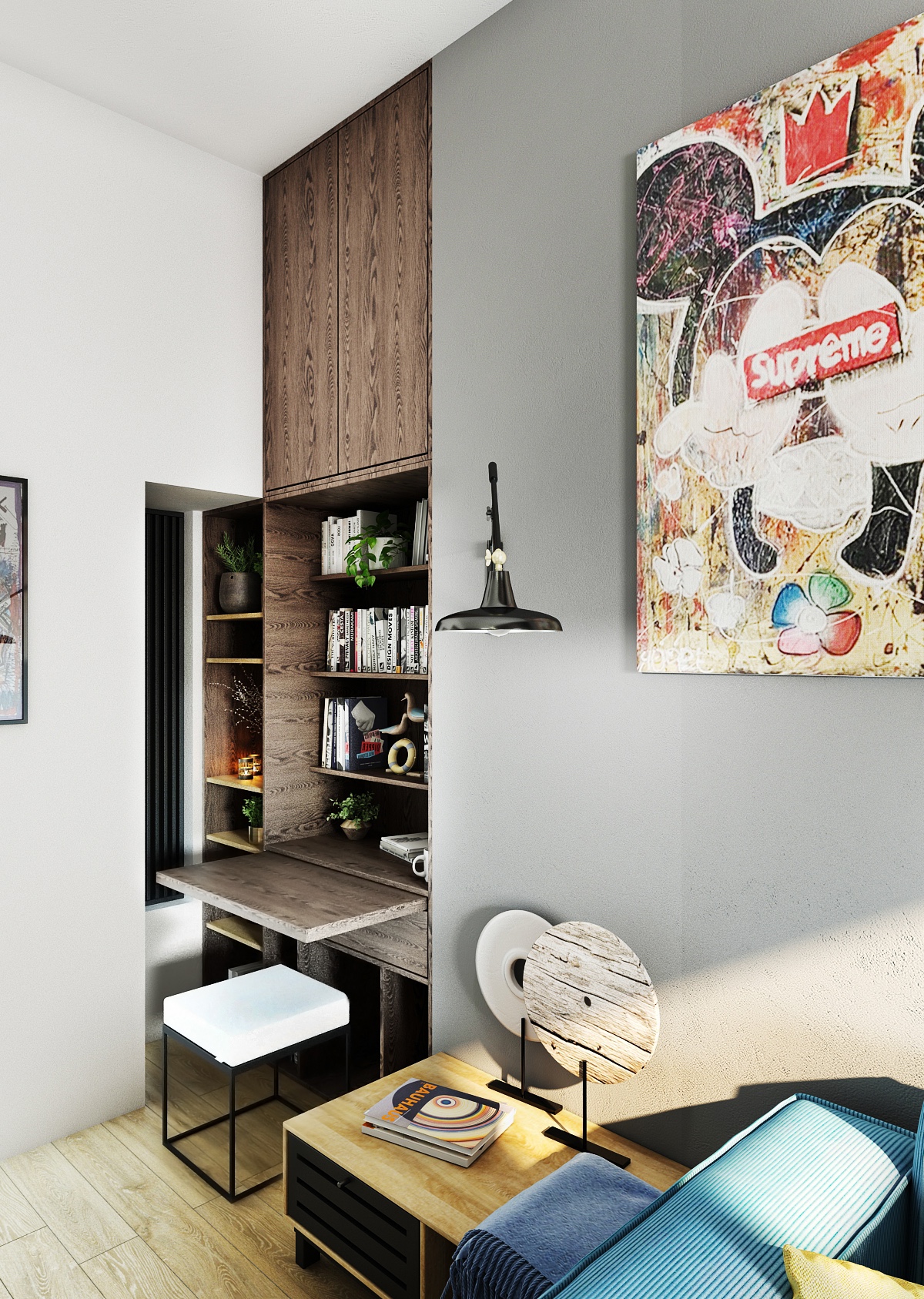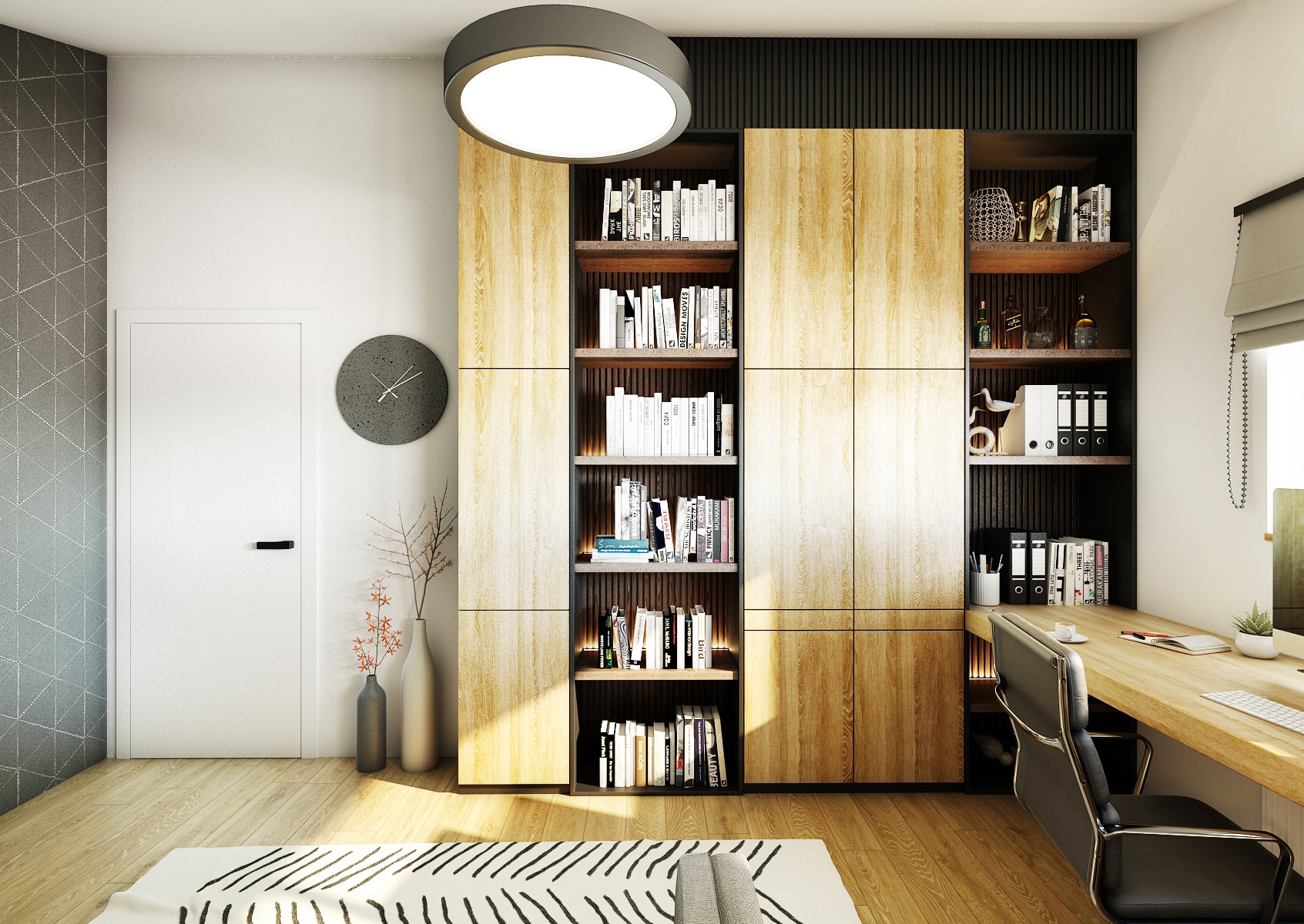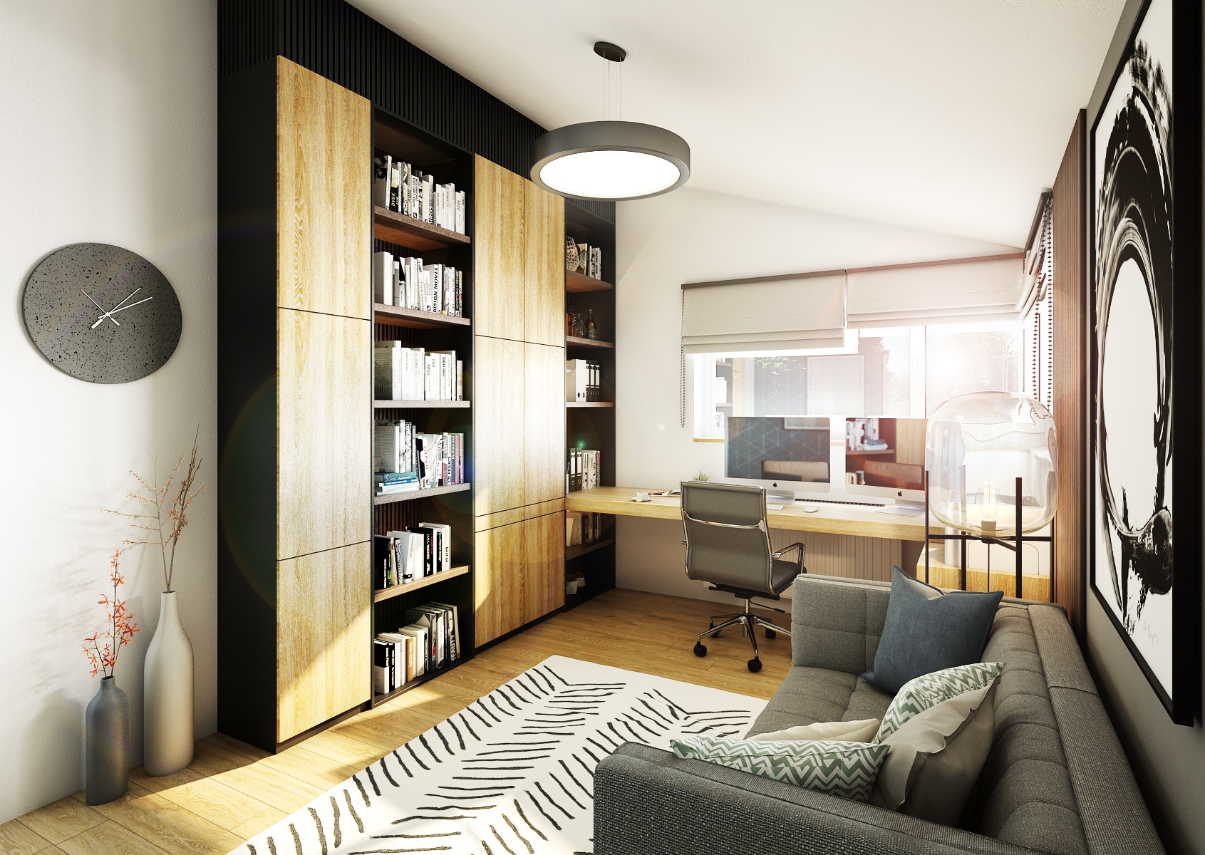 Pracovna v této části domu je navržena s důrazem na funkčnost a organizaci, přičemž neztrácí svůj stylový vzhled. Velký pracovní stůl umístěný pod oknem poskytuje dostatek přirozeného světla, což je ideální pro produktivní práci. Vysoké knihovny s uzavřenými i otevřenými úložnými prostory nabízejí dostatek místa pro knihy a kancelářské potřeby. Pohodlná šedá pohovka slouží jako relaxační zóna, zatímco moderní dekorace, jako jsou designové hodiny a minimalistické vázy, přidávají prostoru estetickou hodnotu. Tento multifunkční prostor je perfektním příkladem, jak kombinovat pracovní a obytné prostředí bez kompromisů v pohodlí a stylu.