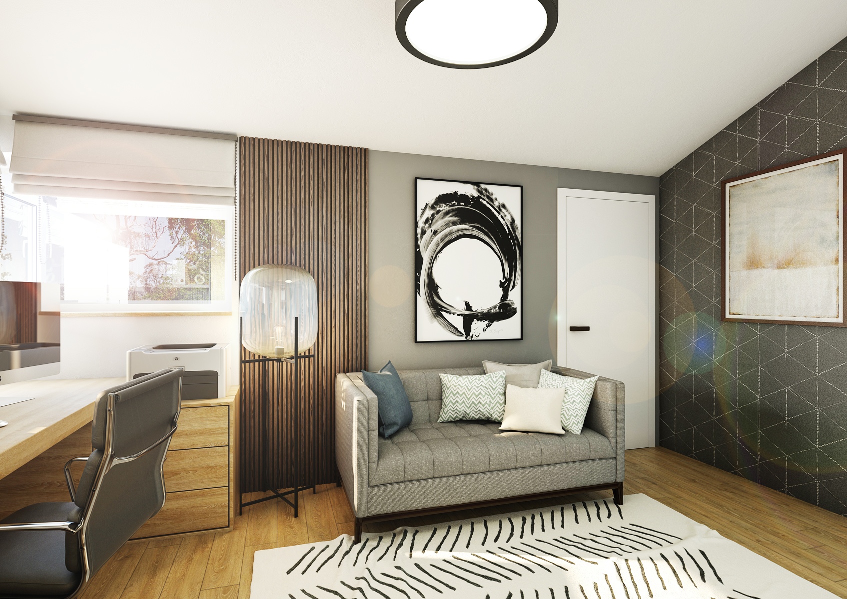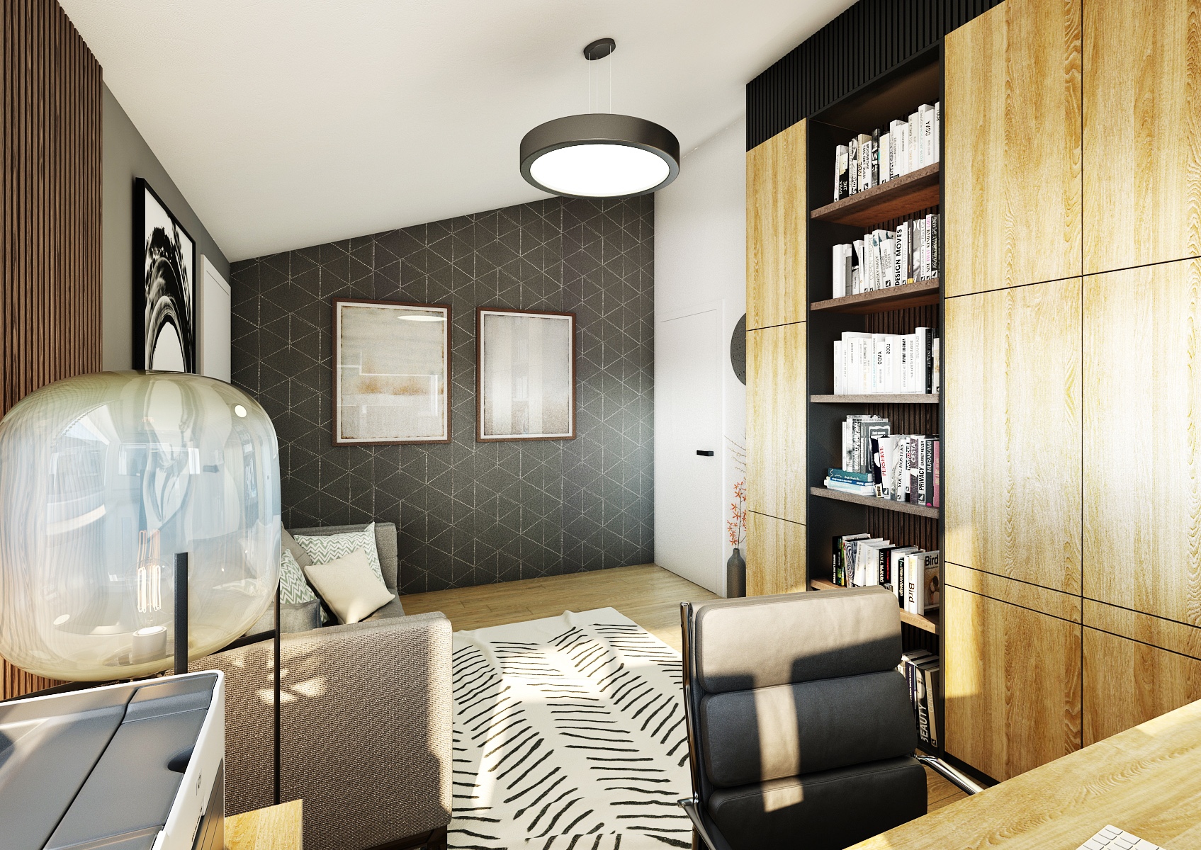 Obytný prostor s pracovnou nabízí harmonickou kombinaci moderního designu a útulného prostředí.