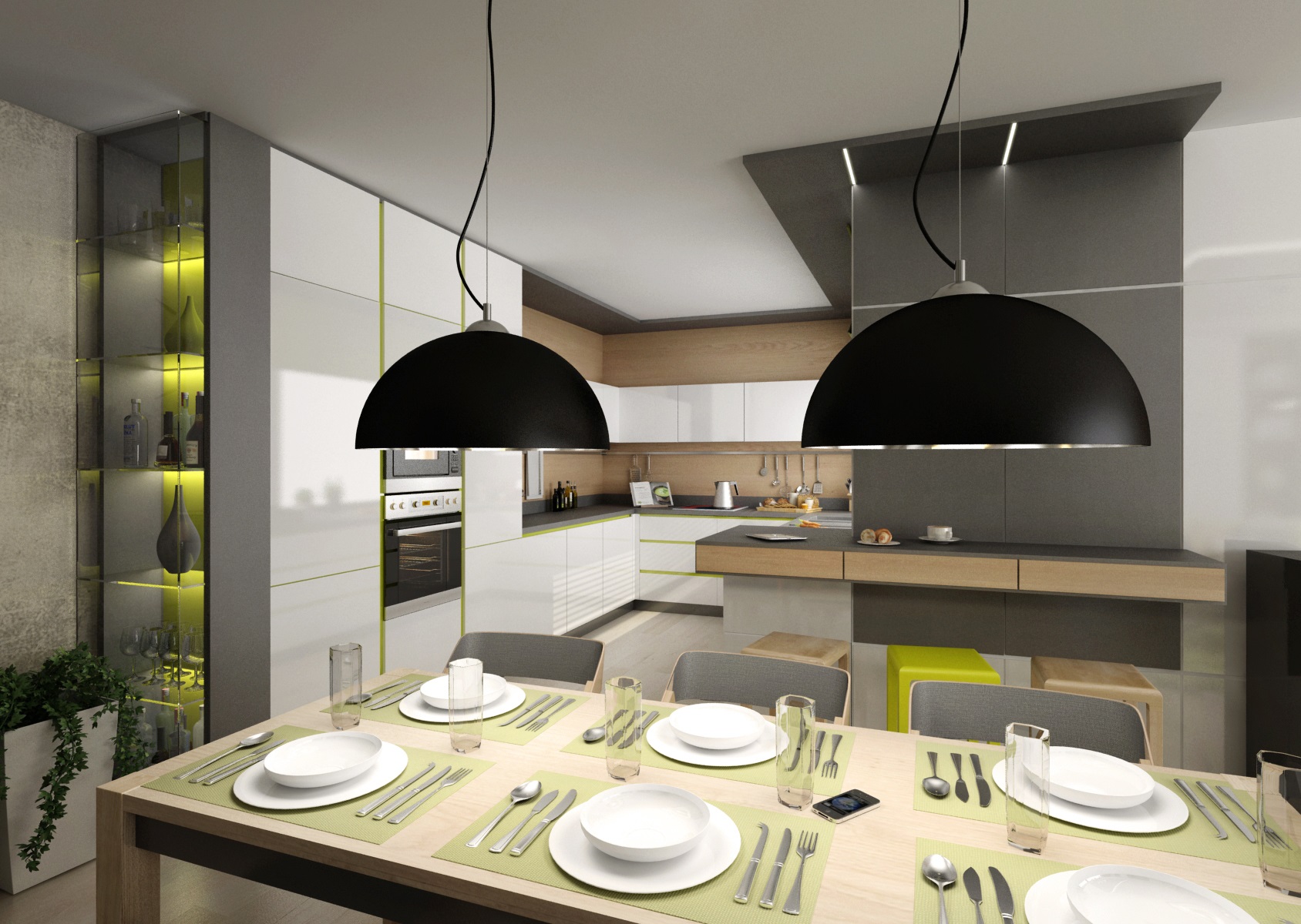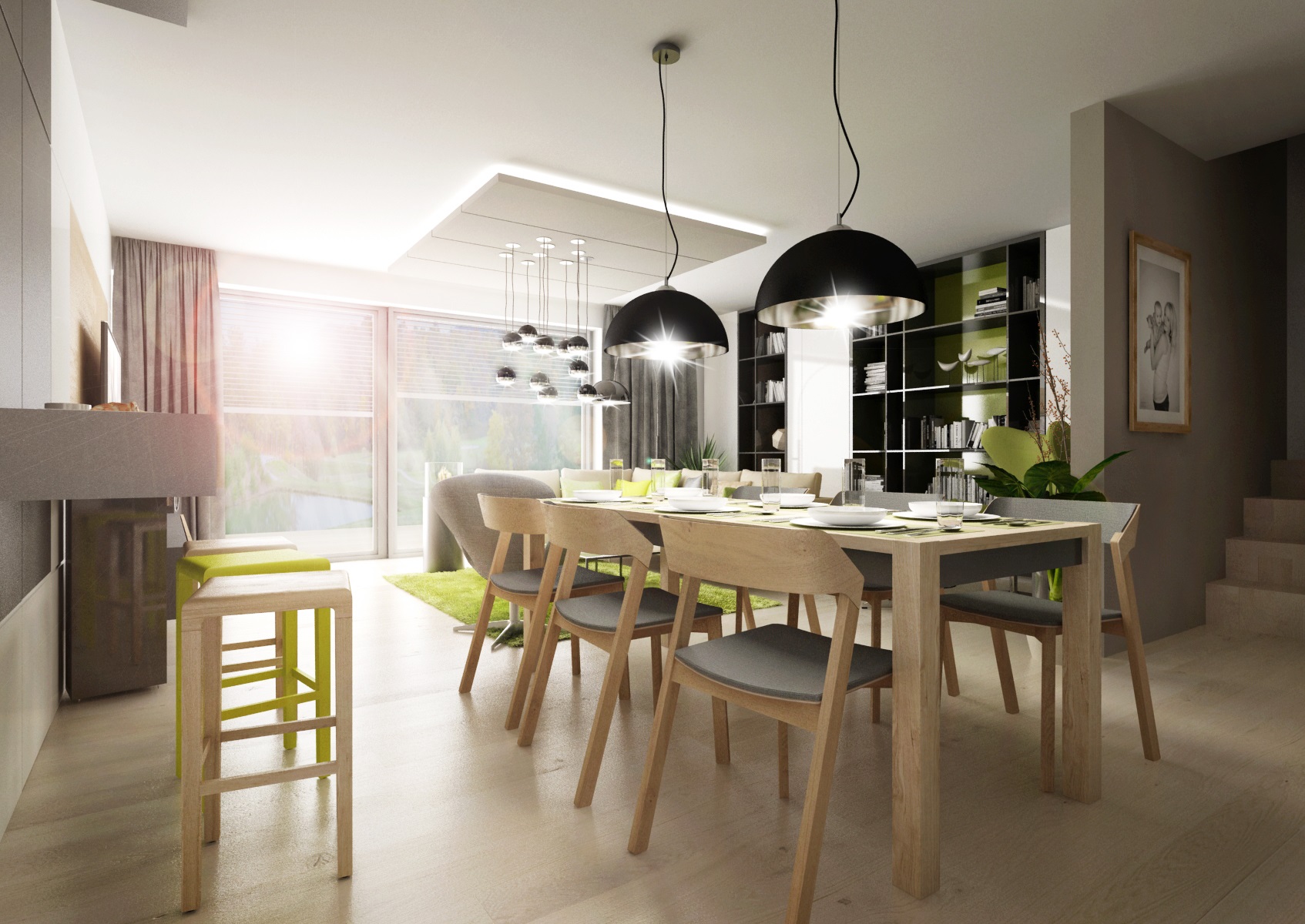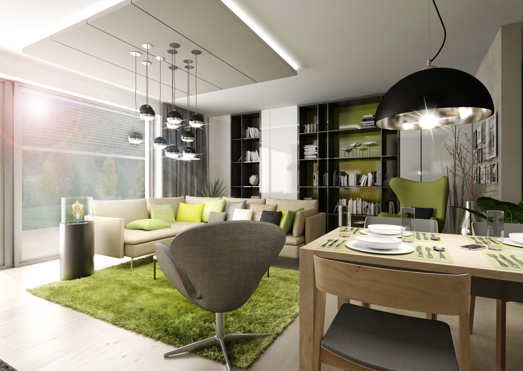 Doplňky a detaily ve svěže zelené barvě byly použity pro oživení interiéru v první variantě návrhu. Například zeleně lakované úchytkové profily na kuchyňské lince, záda knihovny či osvětlené vitrýny nebo bytový textil a čalounění.