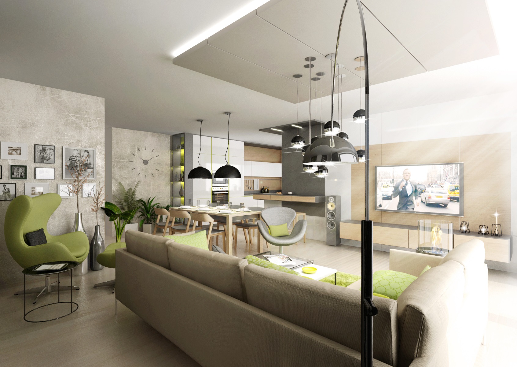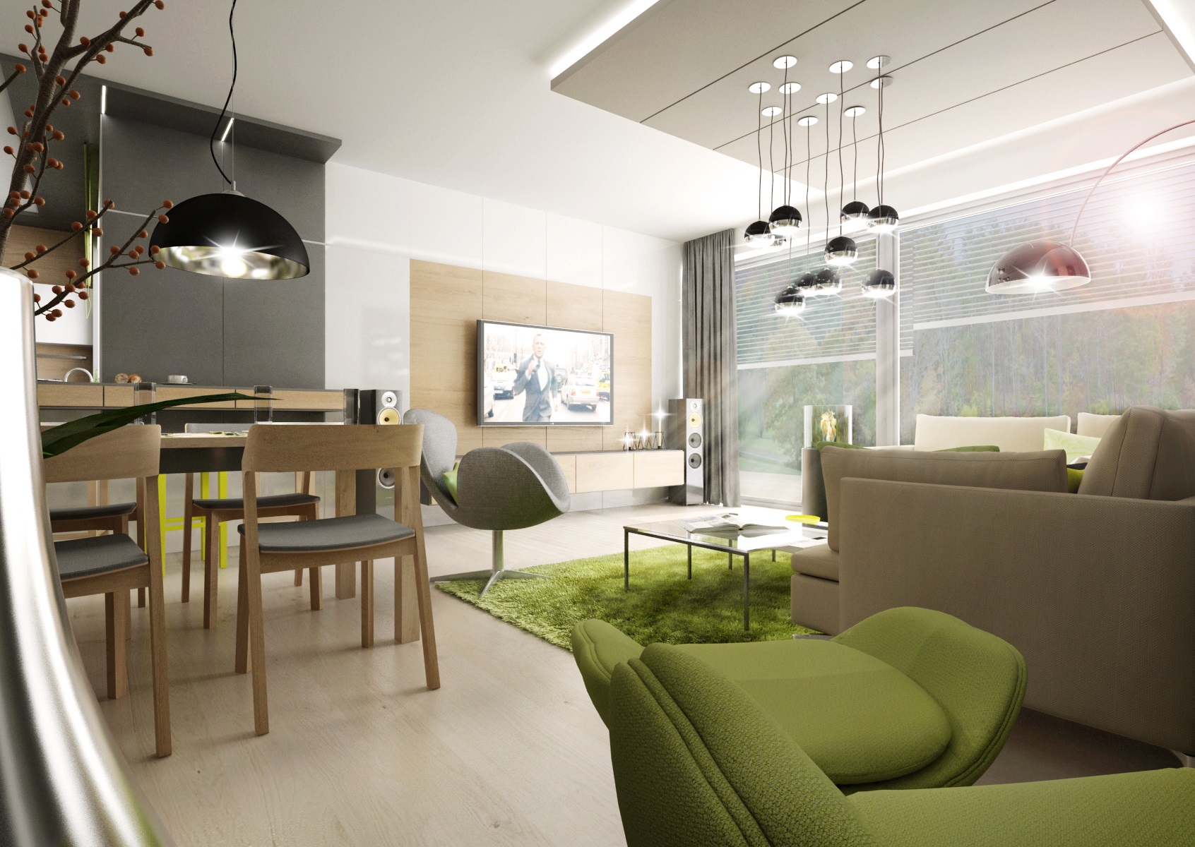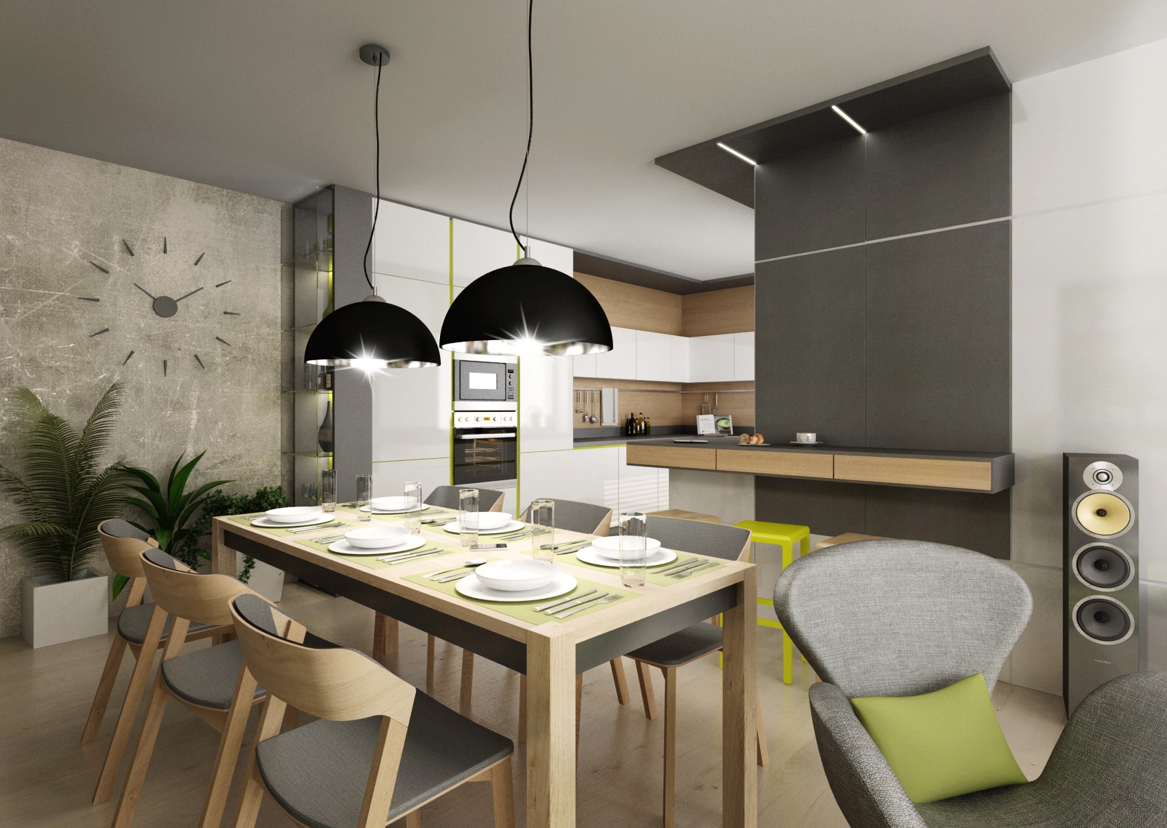 Doplňky a detaily ve svěže zelené barvě byly použity pro oživení interiéru v první variantě návrhu. Například zeleně lakované úchytkové profily na kuchyňské lince, záda knihovny či osvětlené vitrýny nebo bytový textil a čalounění.