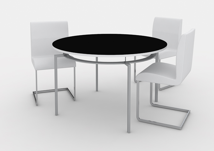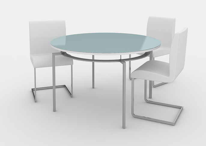 Oblíbený jídelní stůl kombinuje masivní dřevěnou / lakovanou podstavu a skleněnou stolovou desku. Autorem návrhu je Viktor Sinajský.